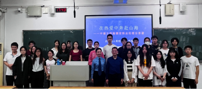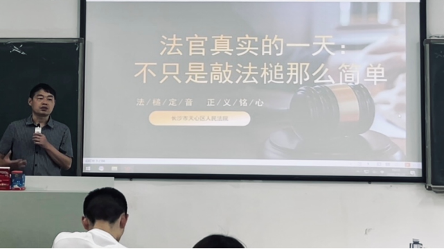 长沙市天心区人民法院综合庭庭长陈泽春法官,则以“法官真实的一天”为主线,通过许多鲜活案例,揭开司法为民的生动图景。他通过分析“许霆盗窃案”“厦门同性伴侣抚养权争夺案”“河南胡阿弟非法经营案”等真实案例,让学生们直观感受到:法律不是冰冷的条文,而是有温度的正义。同时,陈法官也指出部分年轻的司法工作者不敢直面当事人之间的纠纷,甚至“拆东墙补西墙”,走上了违法犯罪的道路。“法官应当解决矛盾,而不是成为矛盾,千万不能害怕矛盾。”陈泽春语重心长地对同学们说,“法律的终极目标是修复社会关系,我们不仅要定分止争,更要让当事人感受到司法的善意。”
