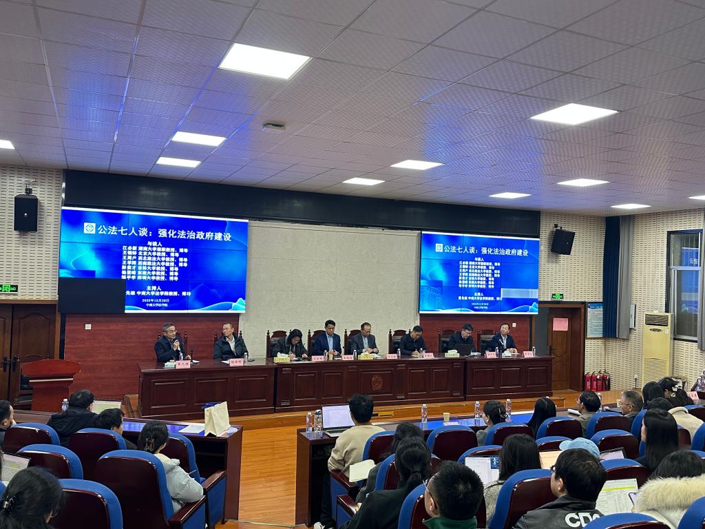 2025年12月28日下午,“公法七人谈:强化法治政府建设”高端学术讲座在yl23411永利集团221报告厅隆重举行。来自湖南大学的江必新(兼职)教授、北京大学的王锡锌教授、西北政法大学的王周户教授、西南政法大学的王学辉教授、吉林大学的彭贵才教授、东南大学的杨登峰教授、深圳大学的邹平学教授七位公法学界著名学者齐聚一堂,围绕新时代法治政府建设的核心议题,展开深度对话与思想碰撞。