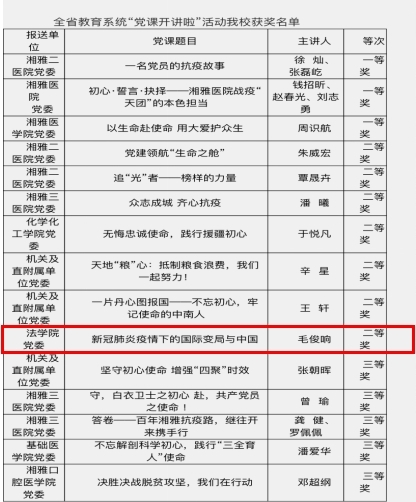 近日,湖南省委教育工委印发了《关于公布“党课开讲啦”活动优秀党课名单的通知》(湘教工委通〔2021〕7号)。据悉,省委教育工委经过遴选推荐和网络展播等环节,共评选出高校组优秀党课一等奖30部、二等奖50部、三等奖80部,优秀组织奖5个。其中,我院党委报送的《新冠肺炎疫情下的国际变局与中国》荣获全省教育系统“党课开讲啦”活动优秀党课二等奖,主讲人为我院党委书记毛俊响教授。