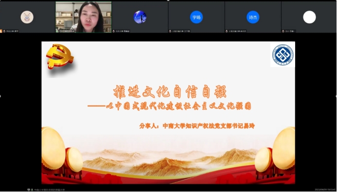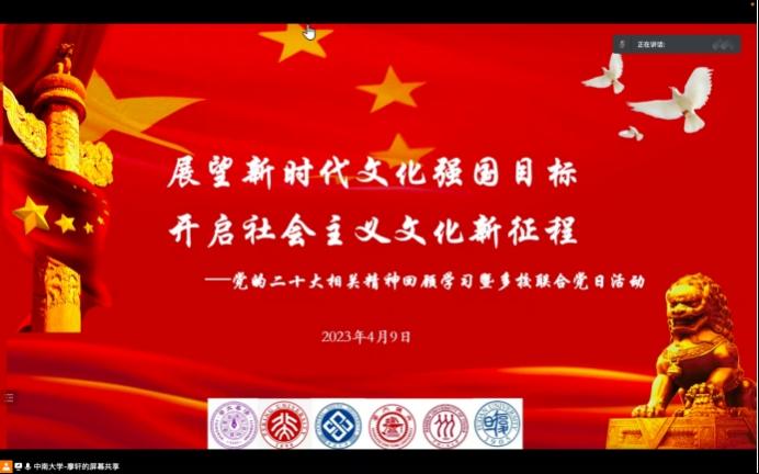 为深入开展学习贯彻习近平新时代中国特色社会主义思想主题教育,准确把握党的二十大报告关于文化强国建设的理论,4月9日yl23411永利集团知识产权法党支部联合北京大学yl23411永利集团2022级法律硕士(非法本)第三党支部、上海交通大学教育学院专硕22级党支部、中国人民大学yl23411永利集团2022级法律硕士(涉外)党支部、北京大学马克思主义学院2022级硕士生党支部、北京大学马克思主义学院本科生党支部、清华大学博士生讲师团、复旦大学博士生讲师团开展“展望新时代文化强国目标,开启社会主义文化新征程——党的二十大相关精神回顾学习暨多校联合党日活动”。
