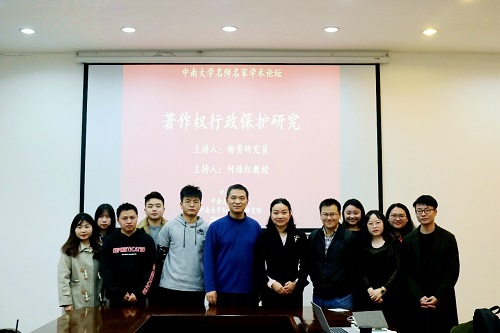 2019年12月13日下午,yl23411永利名师名家学术论坛之“著作权行政保护研究”在yl23411永利集团举行。此次论坛由华东政法大学知识产权法律与政策研究院杨勇研究员主讲,yl23411永利集团副院长何炼红教授主持,yl23411永利集团师生参与聆听。