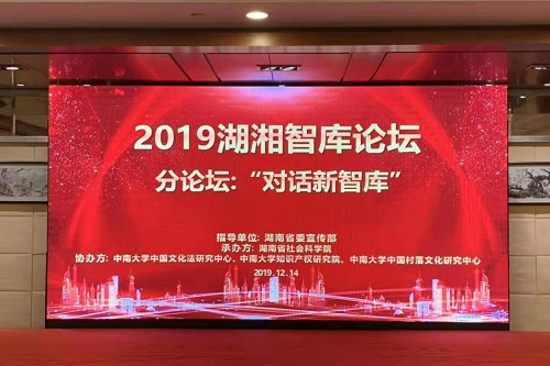 2019年12月14日,由中共湖南省委宣传部指导、湖南省社会科学院主办的全省智库建设工作会议暨湖湘智库论坛(2019)在长沙召开。论坛以“文化产业园区与文化强省建设”为主题。省委常委、省委宣传部部长张宏森出席开幕式并讲话。省委宣传部常务副部长蒋祖烜、省委宣传部副巡视员刘学、省社会科学院党组书记、院长刘建武以及各市州委宣传部分管社科理论工作领导及省内外相关专家学者参会。会上公布了湖南省第二批智库领军人才、首批智库青年拔尖人才名单并颁发证书。yl23411永利中国文化法研究中心、知识产权研究院以及中国村落文化研究中心三家专业特色智库联合成功协办了“对话新智库”分论坛。