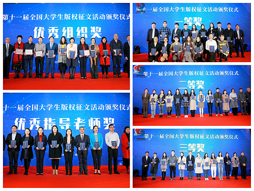 2019年12月4日,第十一届全国大学生版权征文活动颁奖仪式在四川成都举行。本次征文活动历时六个月,共收稿1492篇,其中本科生论文906篇,研究生论文586篇,全国29个省、自治区、直辖市,以及香港、澳门特区,共计234所高校参与。经过形式审查、技术审查、专家评审,最终评选产生了特等奖论文3篇,本科生组和研究生组一等奖论文各10篇、二等奖论文各20篇、三等奖论文各30篇,优秀奖论文30篇,优秀指导老师奖20名,优秀组织奖20名。
