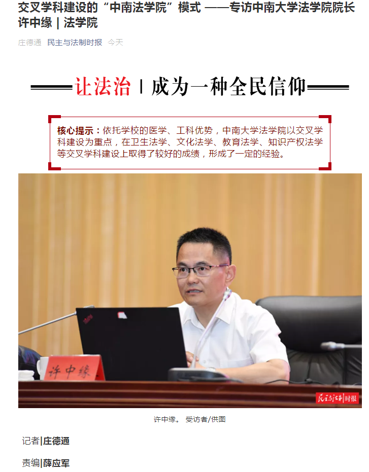 近日,许中缘接受民主与法制社记者专访,介绍了yl23411永利集团打造交叉学科建设的“中南yl23411永利集团”模式经验。
