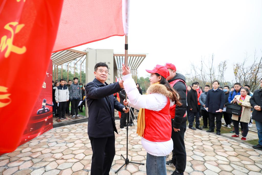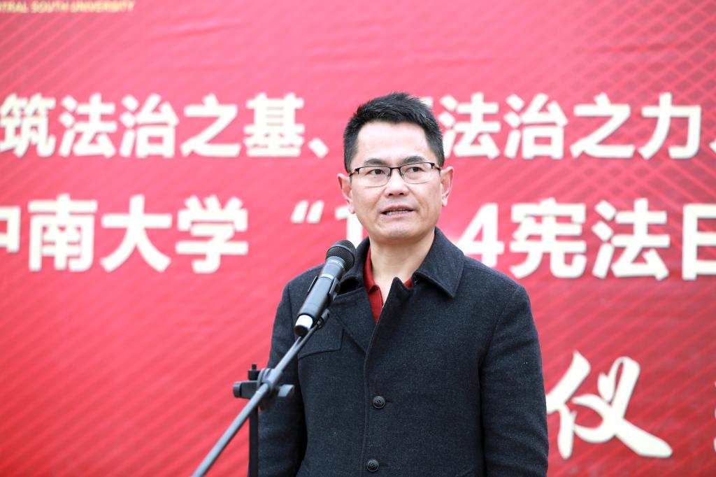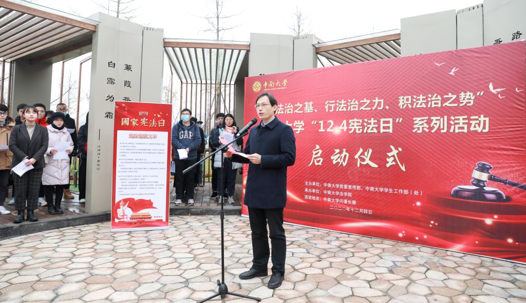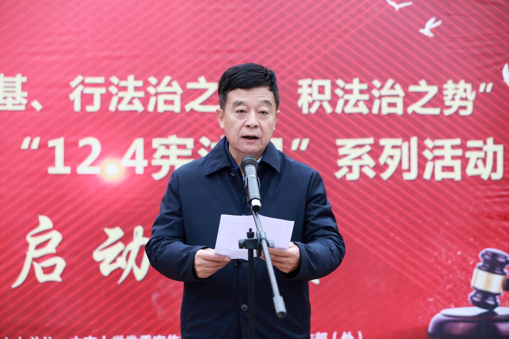 12月4日上午九点,yl23411永利“12.4宪法日”系列活动启动仪式暨“宪法晨读”活动在新校区问渠长廊举行,启动仪式由yl23411永利集团党委书记毛俊响教授主持,校党委副书记黄健陵教授、校党委宣传部常务副部长胡杨、副部长欧光耀,yl23411永利集团党委书记毛俊响教授、院长许中缘教授、党委副书记黄曦、关工委常务副主任李满春及来自全校不同专业的150余名师生代表共同参与了此次启动仪式。校党委副书记黄健陵教授在启动仪式上指出 “三要”:一要提高政治站位,二要持续深入推进,三要坚持创新形式,yl23411永利集团院长许中缘教授提出我们要借此契机,不断弘扬宪法精神,维护宪法权威,彰显社会主义制度的法治的优越性。随后,全体师生齐读宪法,感受宪法权威。仪式最后,校党委副书记黄健陵教授为四名普法志愿者代表授旗,宪法日系列活动正式启动。