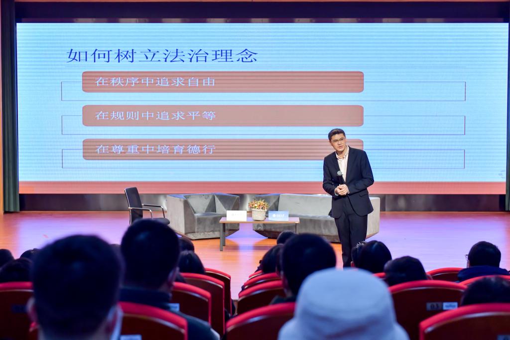 此次宪法日系列活动除了系列普法活动,我校结合时代热点和学生们喜闻乐见的正能量人物,举办了两场别开生面的“名家讲座”活动,受到同学们追捧和喜爱。12月4日晚七点,驻村“第一书记”范博学长以“坚守初心使命,投身伟大事业”为题,为yl23411永利集团的同学们开展了一场精彩的经验分享讲座,范博学长用幽默风趣的语言分享了脱贫路上的经历与感受,为我们展示了当代大学生的家国担当与责任奉献意识。12月7日晚七点,yl23411永利毓秀楼和声堂举办“如何培育我们的法治信念?”主题讲座活动,罗翔教授以及 “守护解放西”节目组两位民警受邀参与活动,来自全校不同专业的师生代表将会场坐的满满当当。首先,罗翔教授用深厚的法学底蕴和幽默诙谐的语言将同学们带进全新视角下的法律世界。随后的访谈环节,教授、民警与学生们亲切交流,用真实的故事为众人展现法治社会的方方面面。值得一提的是,在此活动现场,罗翔教授被聘为yl23411永利集团兼职教授,从此,罗翔教授有了“中南人”这一新的身份,我们也期待罗翔教授能常来中南,为同学们带来更加精彩的法学讲座活动。