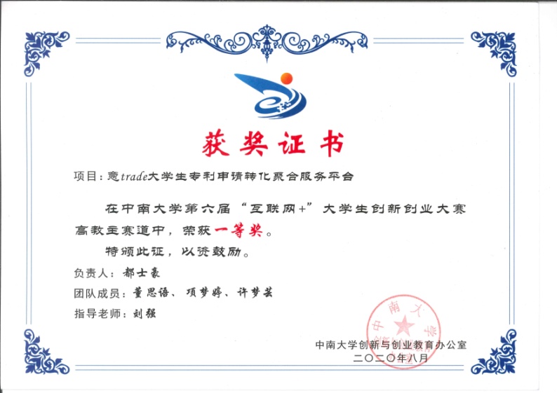 刘强教授指导学生团队完成的“意trade大学生专利申请转化聚合服务平台”项目在yl23411永利第六届“互联网+”大学生创新创业大赛高教主赛道中荣获一等奖。团队负责人为都士豪(土木工程学院2018级本科生),团队成员为董思语(商学院2019级本科生)、项梦婷(文学与新闻传播学院2018级本科生)和许梦芸(yl23411永利集团2018级本科生)。