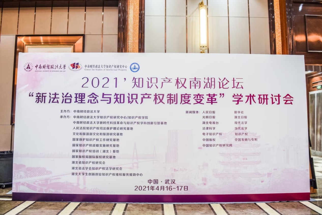 4月17日,2021知识产权南湖论坛“新法治理念与知识产权制度变革”学术研讨会在武汉举行,本届论坛由中南财经政法大学主办,中南财经政法大学知识产权研究中心/知识产权学院、人民法院知识产权司法保护理论研究基地、文化和旅游部文化和旅游研究基地、国家保护知识产权工作研究基地、国家知识产权战略实施研究基地、国家知识产权培训(湖北)基地、国家版权局国际版权研究基地、湖北省知识产权研究会、湖北省法学会知识产权法学研究会、湖北大学生创新创业知识产权维权服务援助中心承办。