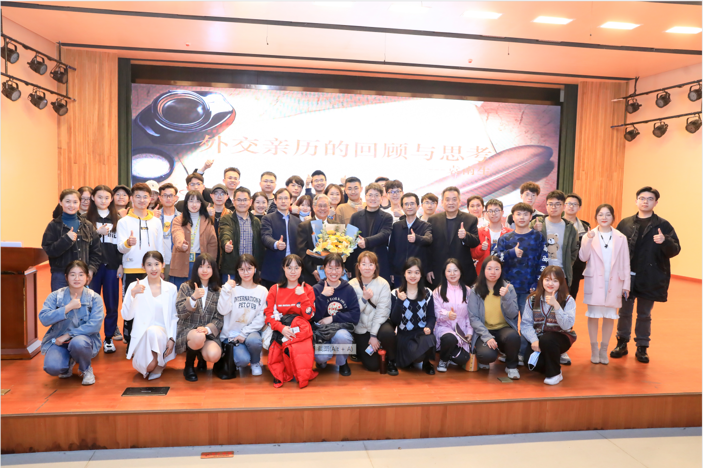 在讲座交流提问环节,袁教授回应了大家都比较关心的中美关系问题,他认为中美关系将长期存在不稳定性,中国与西方的关系也将会变得更加微妙敏感。现场气氛热烈,袁教授耐心回答每位同学的疑问,和蔼可亲、思维敏捷的外交大使形象得到在座同学的阵阵掌声与赞扬!讲座最后,袁教授与受邀嘉宾及学生代表共同合影留恋。至此,本次讲座圆满结束。