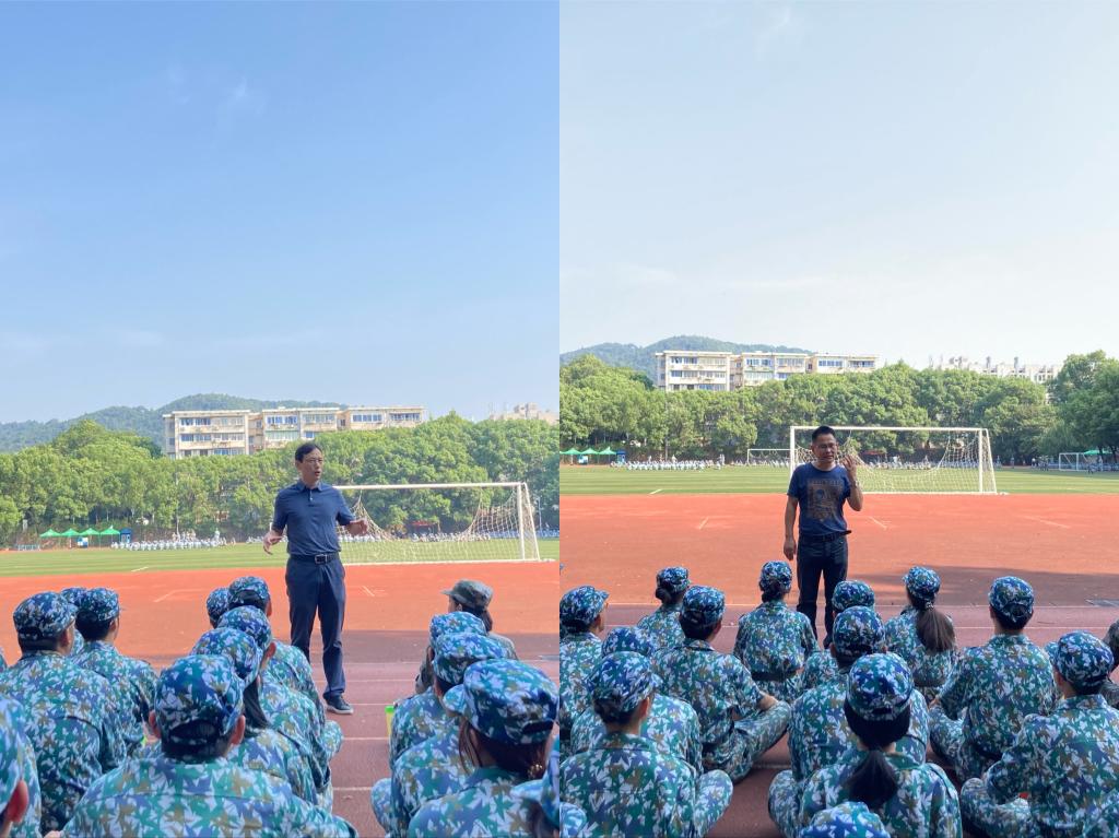 其中,毛书记从自身出发,回忆往昔,谈到在自己的大学生活中没能军训的遗憾,希望同学们珍惜军训的机会与时光。他提到,军训作为大学第一课,既能够教会学生遵守纪律,培养学生集体荣誉感,也能够促进同学之间相互熟悉交流,帮助同学迅速融入大学生活。他希望同学们珍惜军训的实践机会,认真踏实地完成训练,为大学生活添上浓墨重彩的一笔。许院长则以“我们为什么要军训”为引,向同学们讲述了军训的必要性与重要性,他认为军训作为新生必须要参与的实践活动之一,一方面可以帮助同学们锻炼体魄、磨砺意志,另一方面,也让同学们体会到军人保家卫国的不易,使同学们更加珍惜生活、热爱生活。他提到,军训就是让同学们体会平凡中的伟大,一丝不苟下的坚持。日复一日的重复训练,正如我们学习生活中积累的过程,枯燥却意义深刻。