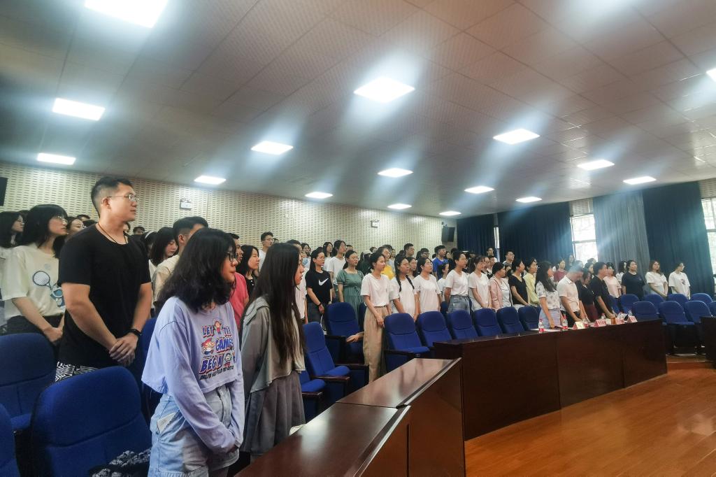 首先,全体起立,奏唱国歌。随后,为纪念“九一八”事变,全体师生向在中国人民抗日战争中英勇牺牲的烈士默哀1分钟。