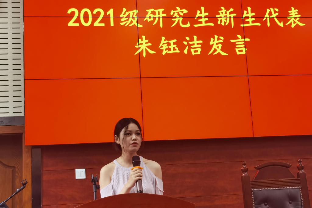紧接着,新生代表朱钰洁在发言中提出,我们正站在自我新旧阶段的交替点和新时代百年征程的新起点,肩负着促进学科发展引领社会进步的光荣使命,当志存高远,勇攀高峰。祝愿大家能在中南的广阔平台上,实现自己的人生理想,在时代激荡之中谱写自己的青春华章。
