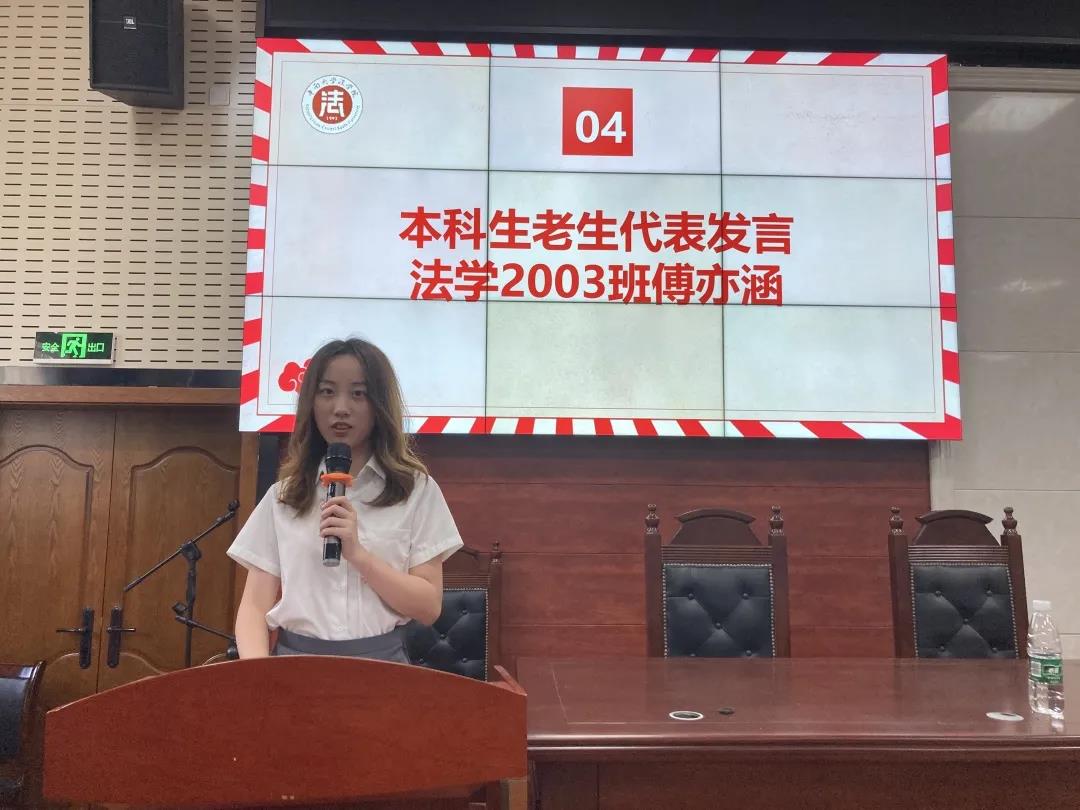 紧接着,2020级本科生傅亦涵作为本科生老生代表发言,她围绕“抱定宗旨,砥砺德行、敬爱师友”三个方面,向学弟学妹们分享了自己大一学习生活的经验和体会,祝福大家能够尽快适应大学生活,并能够在大学这座强调“独立之精神,自由之思想”的殿堂里求知若饥,虚心若愚,继往开来,不辱使命。