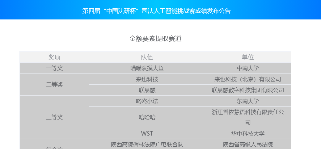 第四届“中国法研杯” 司法人工智能挑战赛是在最高人民法院信息中心的悉心指导下,在北京市石景山区政府、中国电子科技集团科技部和新一代人工智能产业技术创新联盟的支持下,由中国司法大数据研究院(最高人民法院智慧法院重点实验室)联合南京大学软件学院、中国政法大学数据法治研究院、浙江大学上海高等研究院、浙江大学计算机学院、阿里巴巴达摩院和擎盾数据等单位举办的全国性权威赛事。本届赛事设置两大比赛方向,分别是技术能力比赛和创业创新比赛。其中,技术能力比赛围绕“智慧审判辅助”展开,分别设置了刑期预测、犯罪金额要素提取、争议焦点提取三个赛道;创新创业方向面向智慧司法领域设置创新创业项目赛道。