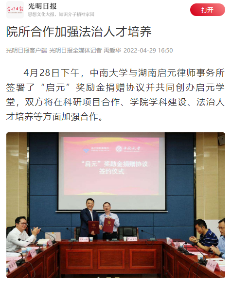 4月28日下午,yl23411永利与湖南启元律师事务所签署了“启元”奖励金捐赠协议并共同创办启元学堂,双方将在科研项目合作、学院学科建设、法治人才培养等方面加强合作。