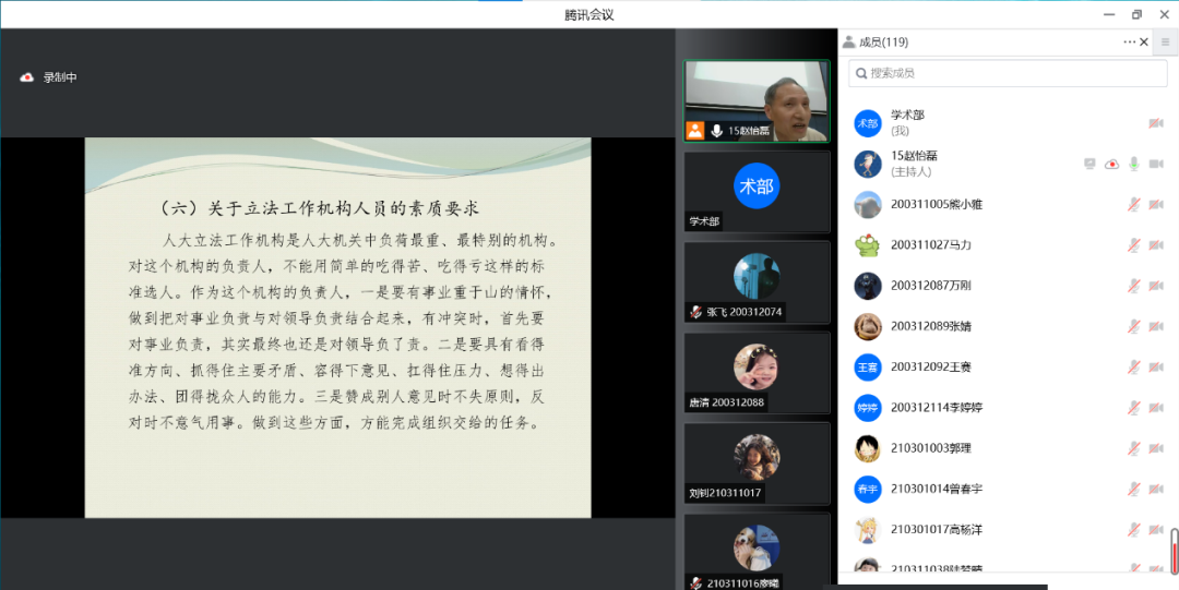 2022年5月27日晚上7点,长沙市人大法制委原主任委员、常委会法工委原主任周伟在yl23411永利集团123会议室开展了以“地方立法理论与实务”为主题的讲座,该讲座在腾讯会议平台同步直播。本次讲座由yl23411永利集团副院长杨清望教授主持,副院长敖双红教授、唐东楚教授、蒋清华副教授、李沫副教授、程能博士等参加本次讲座,线上线下共有170余名师生参与。