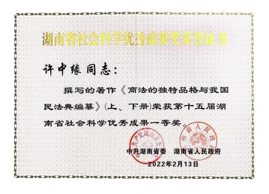 2月16日,湖南省委、省政府发布《关于表彰湖南省社会科学奖获奖成果和专家的通报》许中缘院长撰写的著作《商法的独特品格与我国民法典编纂》(上、下册)一等奖。