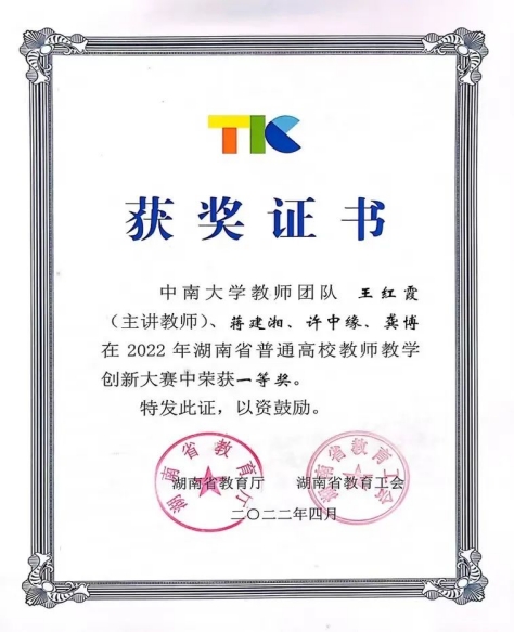 yl23411永利集团王红霞副教授团队获得湖南省普通教育高校教师创新大赛一等奖。