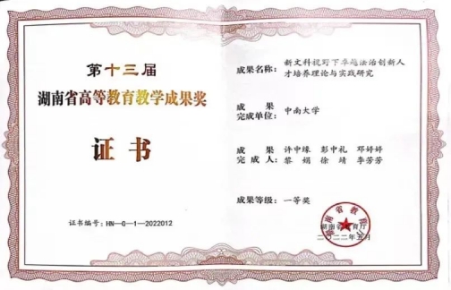 许中缘教授团队的研究成果“新文科视野下卓越法治创新人才培养理论与实践研究”获得湖南省高等教育教学成果一等奖。