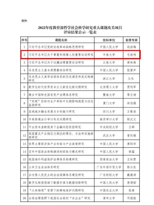 2022年12月13日,教育部社科司公示了2022年度教育部哲学社会永利集团重大课题攻关项目评审结果,共有51个项目入选。其中我院党委书记毛俊响教授的课题“习近平总书记关于尊重和保障人权重要论述研究”位列其中。此外,我院新增国家社科基金后期项目2项(王进文、夏沁)。