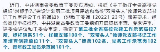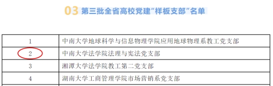 近日,中共湖南省委教育工委公布了全省高校党组织“对标争先”建设计划第三批项目评选结果,其中确定了100个第三批全省高校党建工作“样板支部”,yl23411永利集团法理与宪法党支部入选。