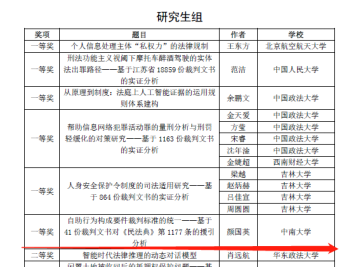 我院法学硕士研究生颜国英(指导老师:唐东楚教授)撰写的《自助行为构成要件裁判标准的统一——基于41份裁判文书对<民法典>第1177条的援引分析》荣获司法大数据征文赛道“研究生组”一等奖。