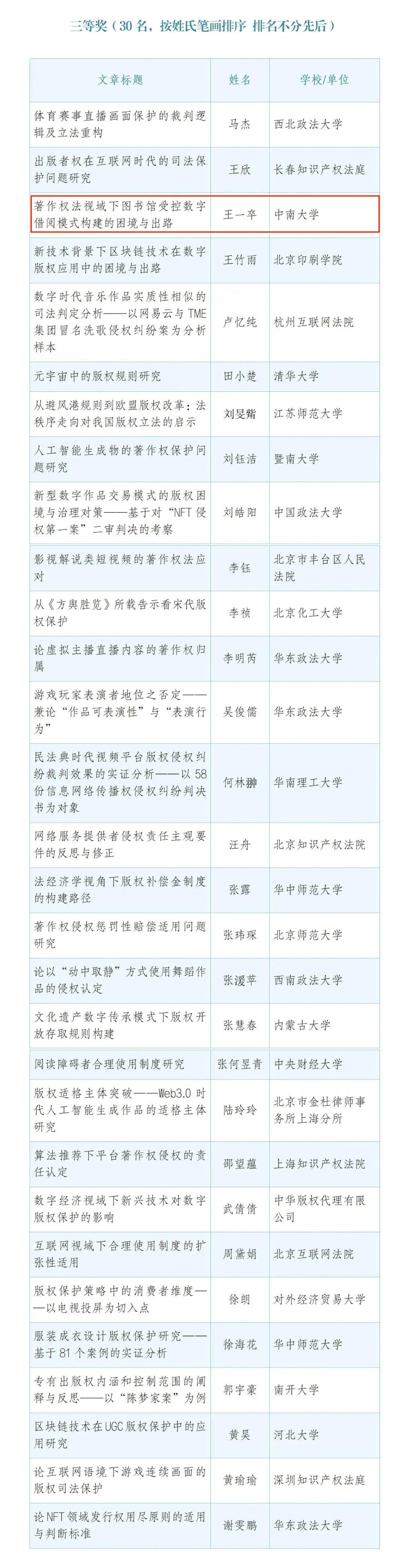 yl23411永利集团、yl23411永利知识产权研究院长期以来积极贯彻落实知识产权强国战略,高度重视知识产权专业人才的教育培养,积极组织学生参加版权征文活动和各类专业竞赛。在本次活动中,再获佳绩。未来,我们将继续深入贯彻落实党中央、国务院关于知识产权强国建设的战略部署,培养更多堪当强国建设重任的时代法治新人,为推动新时代全面依法治国重大战略贡献力量。
