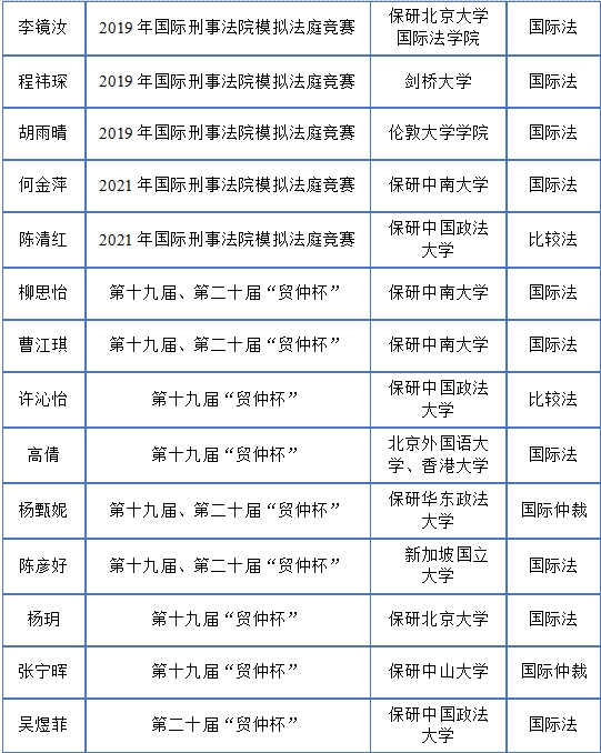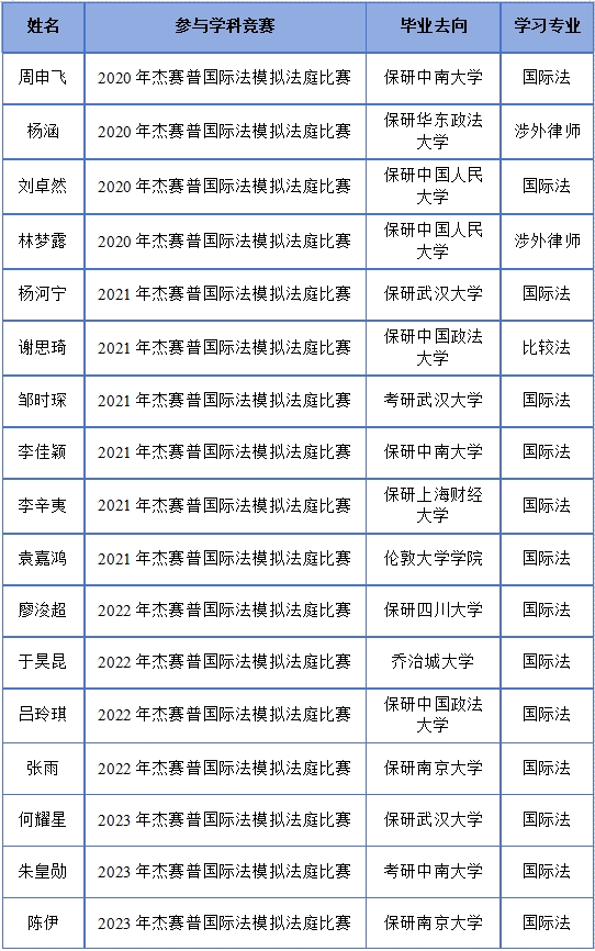 通过参与学科竞赛,极大地调动了学生学习国际法知识的主动性和积极性,提升了其对国际规则的理解和运用能力,同时也树立了学生们投身涉外法治实践的目标。近5年来,已有30多名参加国际法学科竞赛的优秀本科生通过申请、保送等方式前往剑桥大学、伦敦大学学院、新加坡国立大学、香港大学、北京大学、中国人民大学、中国政法大学、武汉大学等境内外一流大学的国际法及相关专业继续深造,成为了未来服务国家涉外法治建设的优秀储备力量。