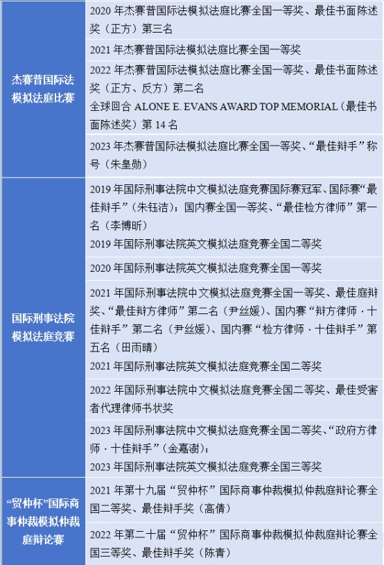 近年来,yl23411永利集团致力于培养知行合一、德才兼修的卓越涉外法治人才,利用自身优势、整合教学资源、组建教师团队,逐步探索形成了以学科竞赛为主要抓手的“理论与实践相互动、知识与思辨相促进、法律与英语相结合、思政与专业相融通”的国际化、复合型卓越涉外法治人才培养模式。作为湖南省最早参与国际法学科竞赛的yl23411永利集团之一,yl23411永利集团2020-2023年连续四年获得“杰赛普”(Jessup)国际法模拟法庭比赛全国一等奖;获得2019年国际刑事法院(ICC)模拟法庭竞赛冠军并多次获得一等奖;获得“贸仲杯”国际商事仲裁模拟仲裁庭辩论赛全国二等奖、三等奖、最佳辩手奖等。