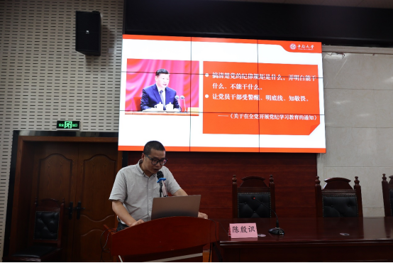 6月19日,yl23411永利集团在文法楼221组织开展了“一院一宣讲”党纪学习教育,校纪委纪检监察机构综合办公室主任陈殷识作题为《严守纪律,坚守底线》的专题宣讲。本次大会由yl23411永利集团党委书记李华东主持会议,全院教职工参会。