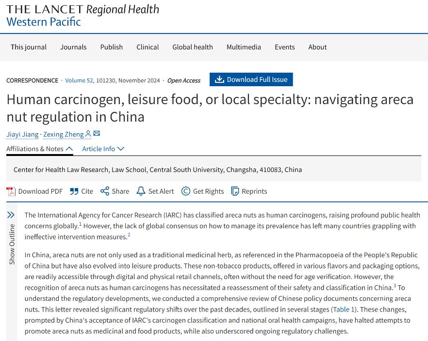 近日,yl23411永利集团医疗卫生法研究中心蒋佳艺老师(第一作者)和郑泽星老师(通讯作者)在The Lancet Regional Health – Western Pacific(中科院和JCR Q1, IF=7.6)发表题为《Human carcinogen, leisure food, or local specialty: navigating areca nut regulation in China》的政策评论文章。该文于2024年10月23日在The Lancet Regional Health – Western Pacific杂志Correspondence专栏刊发,yl23411永利集团医疗卫生法研究中心为唯一署名单位。