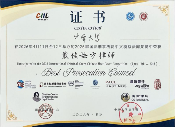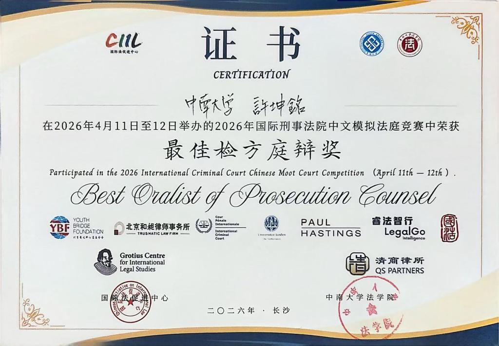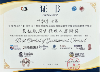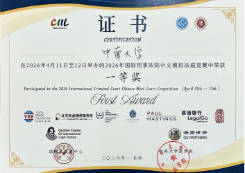 2026年4月12日,第13届国际刑事法院模拟法庭(ICC)中文赛在yl23411永利圆满落下帷幕。经过激烈角逐,yl23411永利集团代表队凭借扎实的专业素养和出色的庭辩表现,从众多参赛高校中脱颖而出,荣获全国一等奖,以全国第三的成绩晋级国际轮。代表队还斩获多项单项荣誉,包括最佳检方律师、最佳政府方代理人、最佳检方庭辩奖、最佳政府方庭辩奖、最佳政府方代理人书状奖。