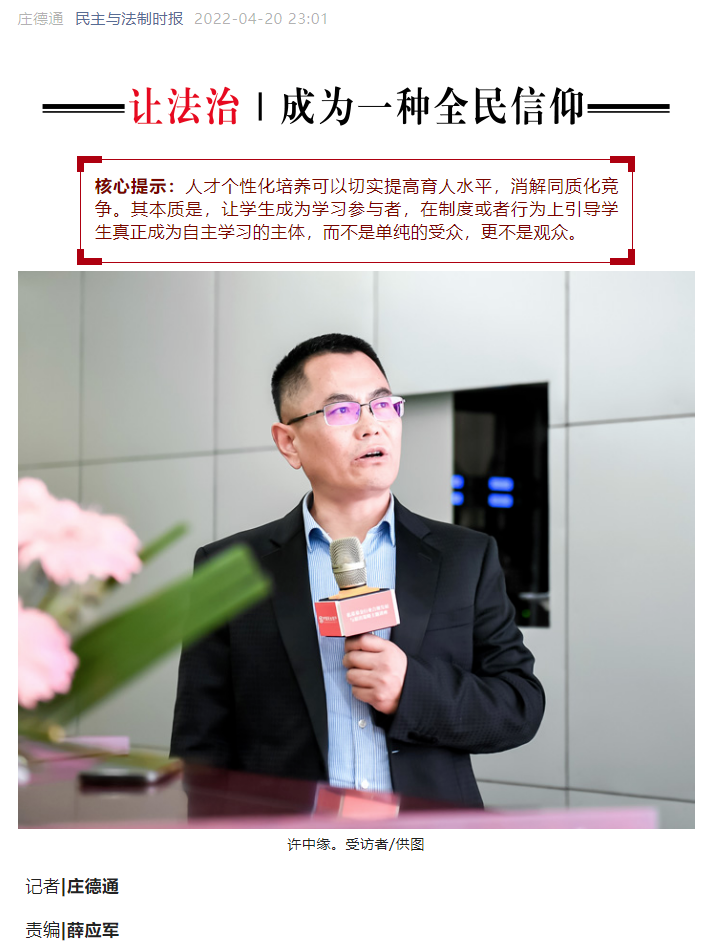 个性化教育日渐成为普及化阶段高等教育的一个重要特征。如何尊重学生个体的独特性,帮助每一个学生成长成人成才,真正做到因材施教?近日,yl23411永利集团院长许中缘接受民主与法制社记者专访,结合yl23411永利集团教学实践经验,分享了他的人才个性化培养观点。