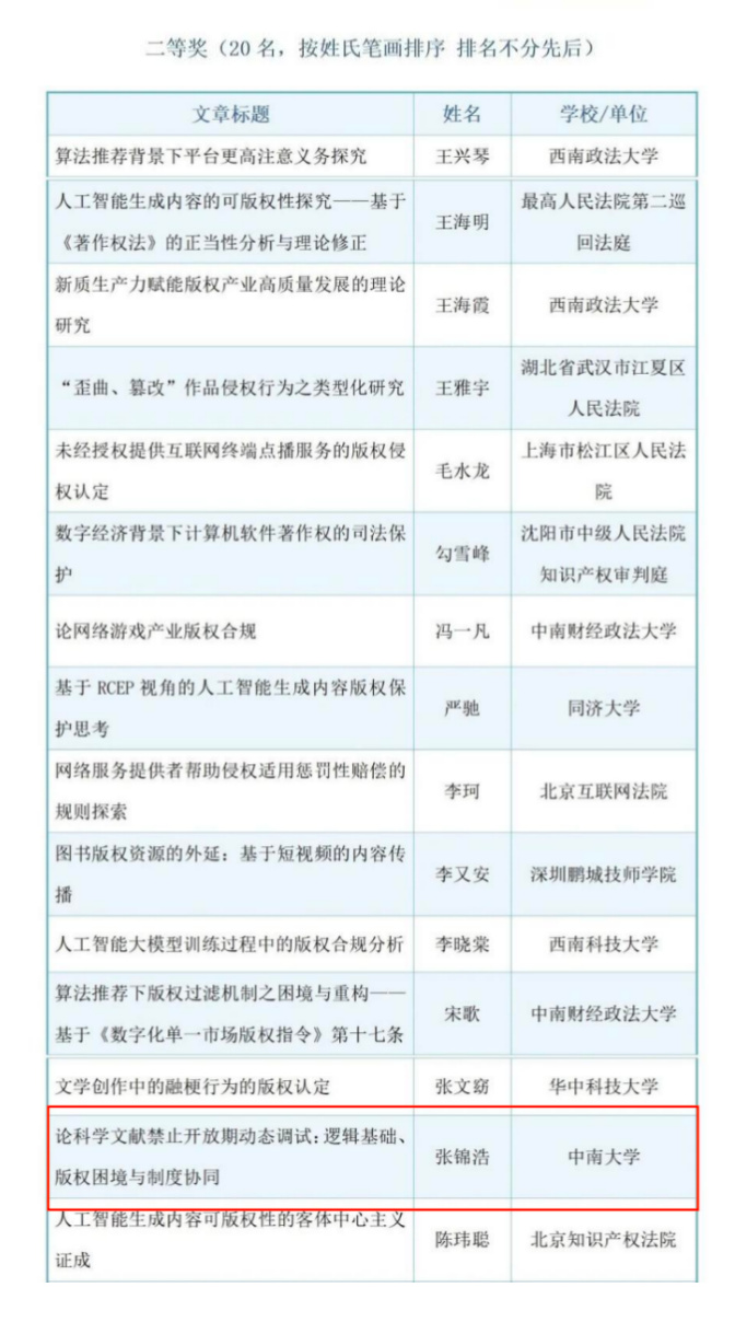 此次征文活动为知识产权领域青年人才的成长提供了重要平台,也为中国版权事业发展注入了青春活力。yl23411永利知识产权研究院始终坚持对接国家战略需求,注重学术研究与现实问题相结合,在青年学术人才培养方面取得扎实成效。未来,我院将继续鼓励青年学子立足中国实践、聚焦前沿问题,开展兼具理论深度与现实关怀的创新研究;同时,进一步加强产学研协同与跨界交流,为版权强国建设和知识产权事业高质量发展持续贡献中南智慧与青年力量。